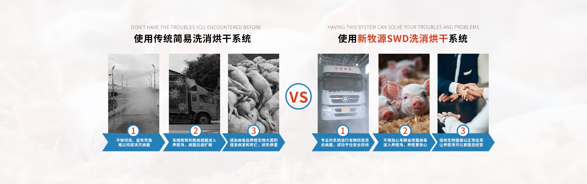每天來往養(yǎng)殖場的各種車輛,是外來病菌的“旅游大巴車”,新引入的病原微生物往往對豬場造成毀滅性的打擊,SWD洗消烘干系統(tǒng)是牧場首道防線,徹底切斷外界病原的傳播途徑,建造牧場完美的生物安全體系!